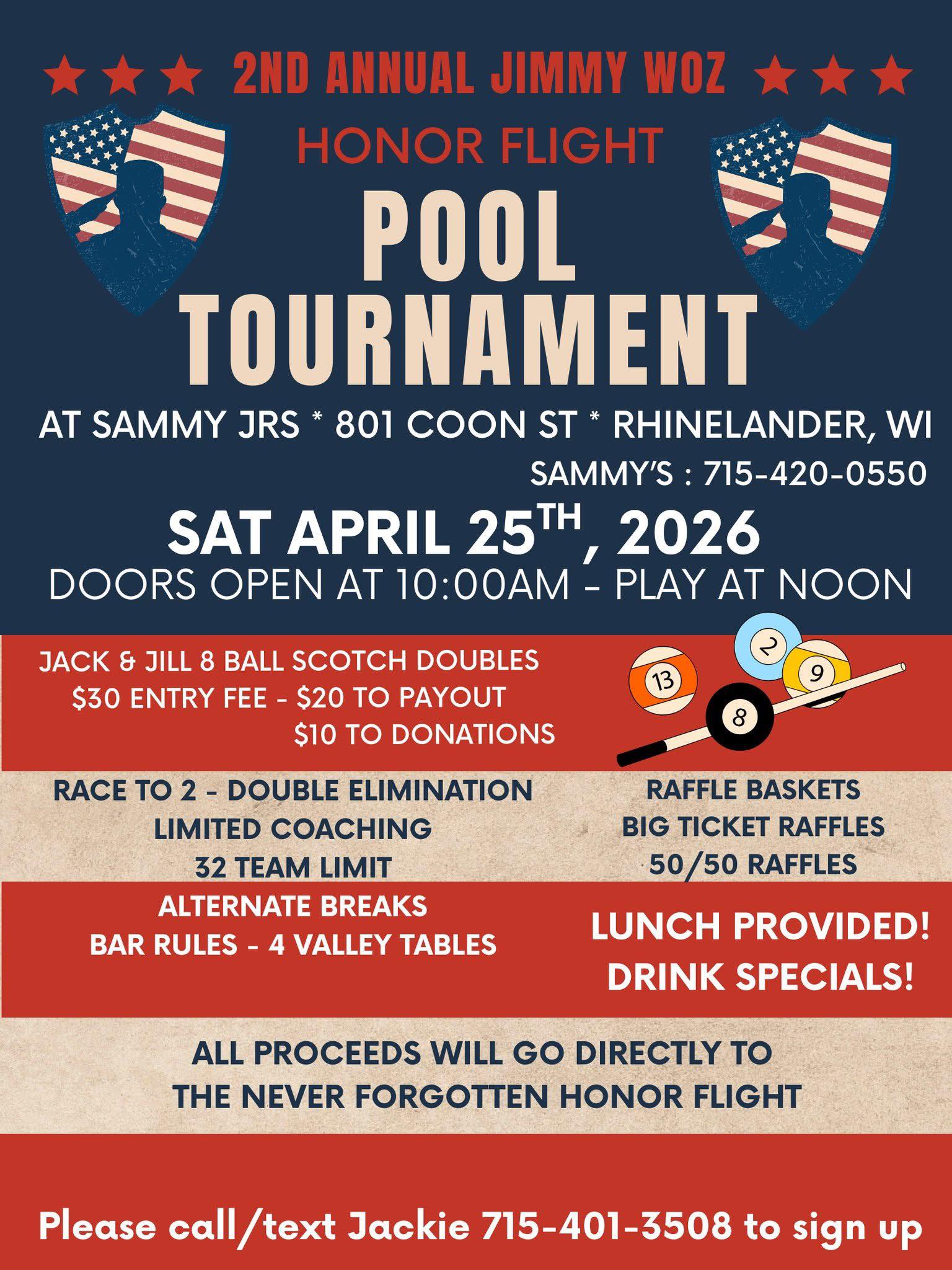 25 – Northwoods Honor Flight Benefit Pool tourney, Sammy’s in Rhinelander, noon (POSTER)