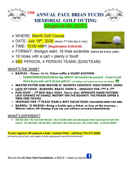 18 – 12th annual At Your Feet Foundation golf outing, Merrill golf course (POSTER)