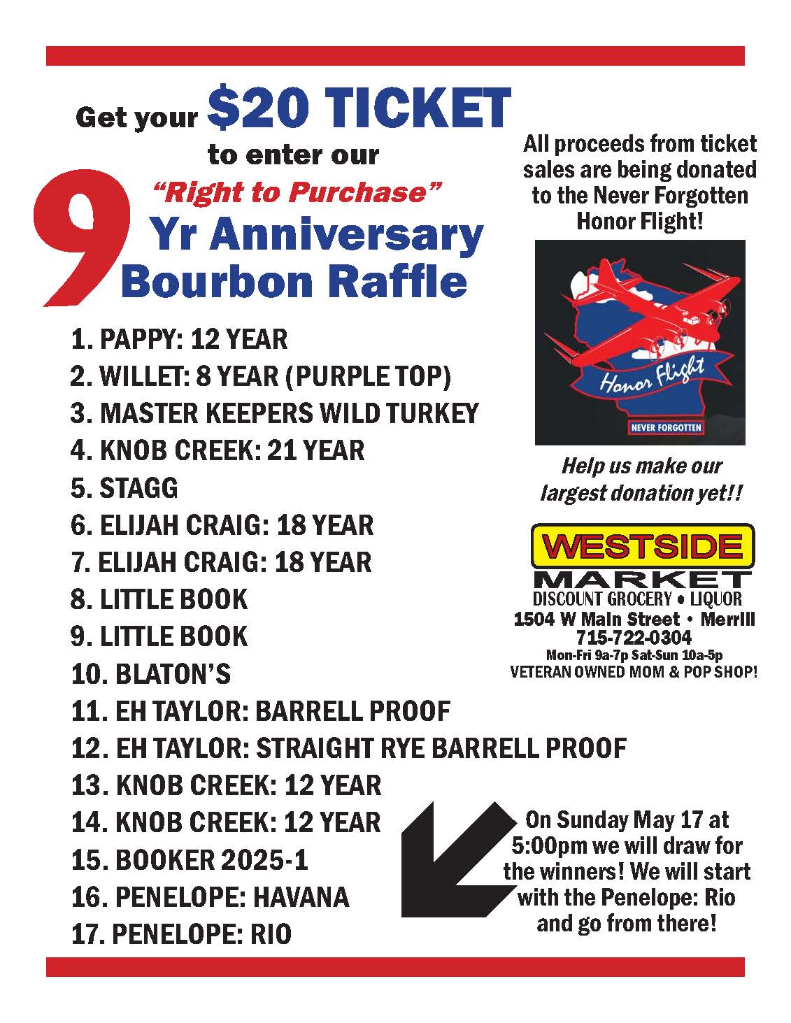 17- May 17 9th anniversary bourbon raffle, Westside Market in Merrill (POSTER)