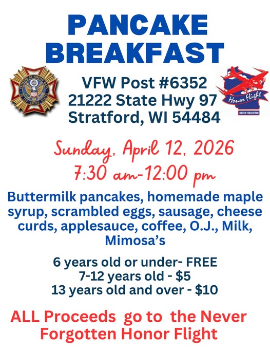 12 – Pancake fundraising Breakfast for NFHF, Stratford VFW (POSTER)